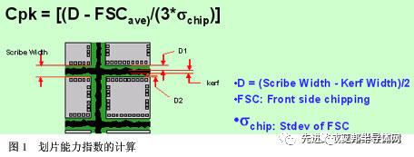 封裝工藝設(shè)計規(guī)則限定崩角不能進入芯片邊緣的密封圈。如果將崩角大小作為評核晶圓切割質(zhì)量/能力的一個指標,則可用公式來計算晶圓切割能力指數(shù)(Cpk)(圖1)。