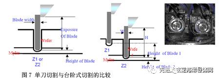 臺階式切割使用兩個劃片刀,第一劃片刀較厚,依程序切入晶圓內(nèi)某一深度,第二劃片刀較薄,它沿第一劃片刀切割的中心位置切透整個晶圓并深入承載薄膜的1/3厚度。臺階式切割的優(yōu)點在于:減小了劃片刀在切割過程中對晶圓施加的壓力;減少了必須使用較高的刀高/刀寬比的劃片刀所帶來的機械擺動和嚴重的崩角問題;提供了選擇不同類型的劃片刀的可能性來分別優(yōu)化正面崩角/分層及背面崩角。