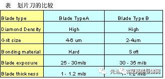 對于低k晶圓而言,金屬層/ILD層的分層或剝離以及崩角相比生產(chǎn)成本更重要(在生產(chǎn)成本允許范圍內(nèi))。基于實驗,優(yōu)選2-4um的金剛石顆粒、較低的金剛石密度和較軟的粘結(jié)材料的劃片刀作為進一步優(yōu)化劃片制程的基礎(chǔ)。圖6是不同類型的劃片刀切割質(zhì)量的比較。劃片刀A具有較大的金剛石顆粒,較硬的粘結(jié)材料,而劃片刀B具有較小的金剛石顆粒,較軟的粘結(jié)材料(表),很明顯,劃片刀B的切割質(zhì)量優(yōu)于劃片刀A?!?/span>