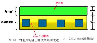 另外,在有限的街區(qū)寬度內(nèi)(比如120um),如果能將測試圖案限制在70um之內(nèi),并將其偏置于街區(qū)的一側(cè),那么,在街區(qū)的另一側(cè),就形成了一個寬為50um的“空白”區(qū)域。如果將這個50um寬的區(qū)域作為假想街區(qū),則低k晶圓的劃片就演變?yōu)橐粋€窄街區(qū)(50um)非低k晶圓的劃片問題(圖10)。以目前劃片機和劃片工藝能力來說,這種切割方式是可行的。