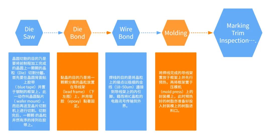 以上是一個簡化的流程,實際的半導(dǎo)體封測流程可能會因產(chǎn)品類型、封裝類型以及制造商的工藝差異而有所不同,同時也衍生了大量的專業(yè)術(shù)語。接下來,本文將針對其中三個關(guān)鍵的制程進行介紹。